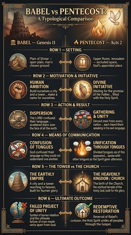 Throughout scripture, a recurring pattern exists where God takes the wreckage of one moment and builds something glorious out of it in another. A type is planted in the Old Testament, and its fulfillment blooms in the New. We see this with Adam and Christ, with the Passover lamb and the cross, with the flood and baptism. But one of the most overlooked and breathtaking symmetries is that between the Tower of Babel in Genesis 11 and the Day of Pentecost in Acts 2.